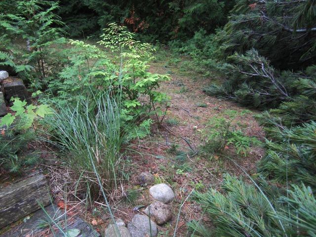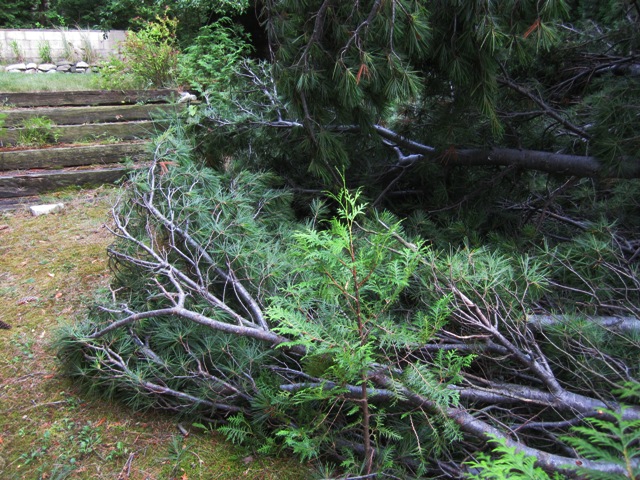 In the final photo you can see the limbs that may—or may not—cover damaged little trees. You can see a little cedar tree in the foreground, and the steps to the rear. I inspected in a gingerly fashion and saw nothing buried in there. Even if there is something in there, it might well spring back and survive.