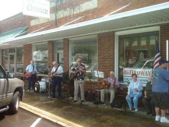 The picture today doesn’t look like much, but maybe I can bring it to life for you. We stopped for lunch outside Decaturville TN at a place called Susie Pat’s or something similar. Great food – Tom pronounced it the best cheeseburger he’d had in a long time – and very inexpensive. We stayed to rest, review maps, and make reservations for Sunday night. After lunch we passed through town, almost a ghost town like so many small town squares, and heard this music, which I can only say sounded like something out if the movie “Oh Brother Where Art Thou?”. These were all men in their seventies playing music for a get-together in front of the campaign headquarters for a candidate for Decatur County mayor. I never heard of a county mayor. Anyway, I couldn’t stand it, had to stop and take their picture. The candidate came to shake my hand, (yuck, dirty cycling gloves!), they all offered us water, and they were as nice as could be. We went on our way, and for the next couple of miles I could hear Tom back there wailing a country tune of his own making. He doesn’t sing much, but he can carry a tune. Cracked me up. I’m afraid the picture doesn’t do justice to the experience.