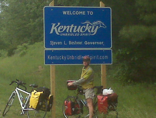 I am overwhelmed with the feedback I got about yesterday’s picture. Now I feel like every picture has to measure up, and it just can’t be so. These pictures are coming off of my phone, I’m a lousy photographer, and that one was just a fortunate accident. Having said that, today’s picture is, obviously, Tom standing in front of the welcome sign for the state of Kentucky. YAY! We’re in Kentucky!!! Tennessee was great and I kind of hated to leave it, but this is evidence of forward progress!